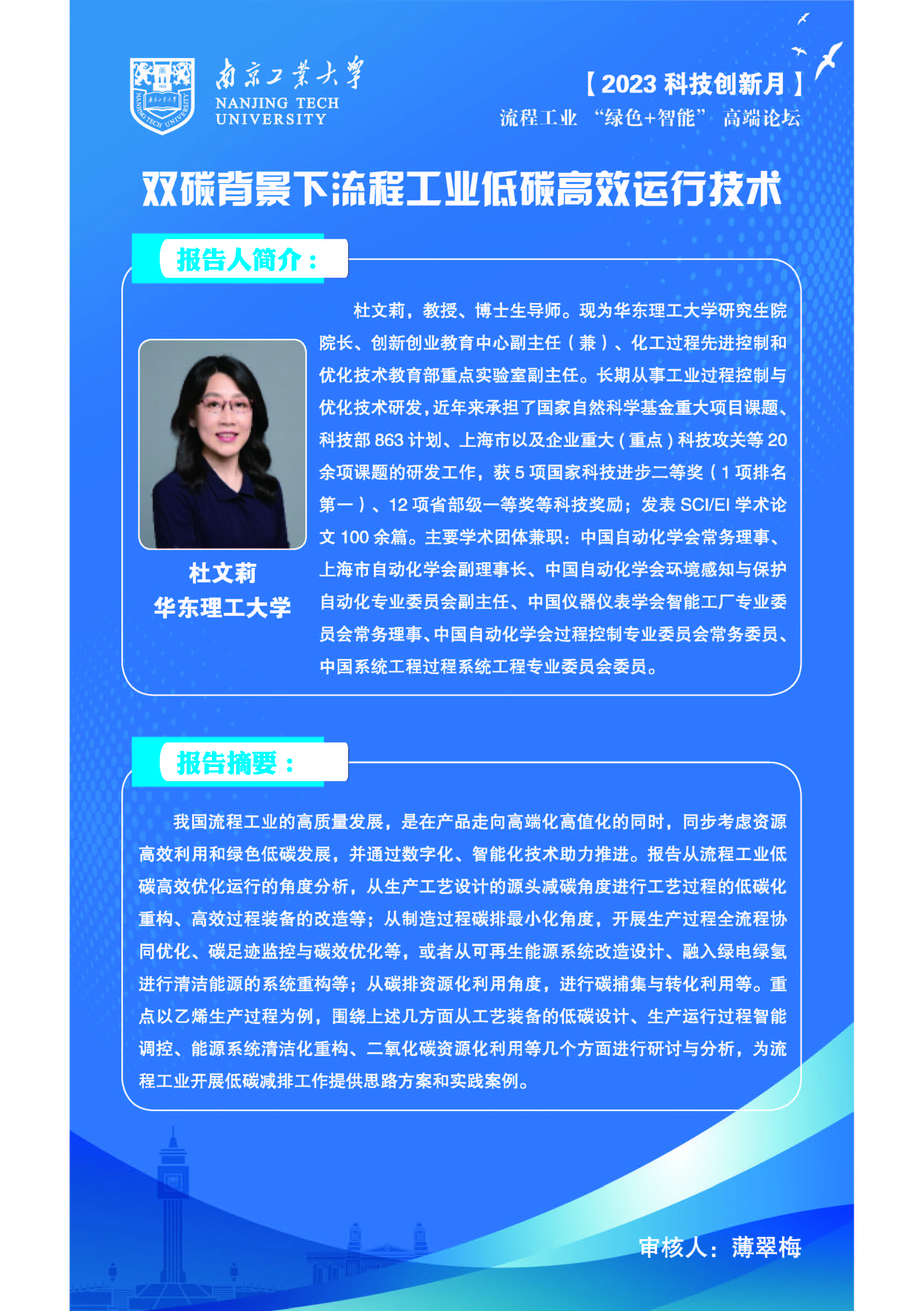 3 | 杜文莉 | 华东理工大学研究生院院长、创新创业教育中心副主任(兼)、化工过程先进控制和优化技术教育部重点实验室副主任 | 双碳背景下流程工业低碳高效运行技术 |