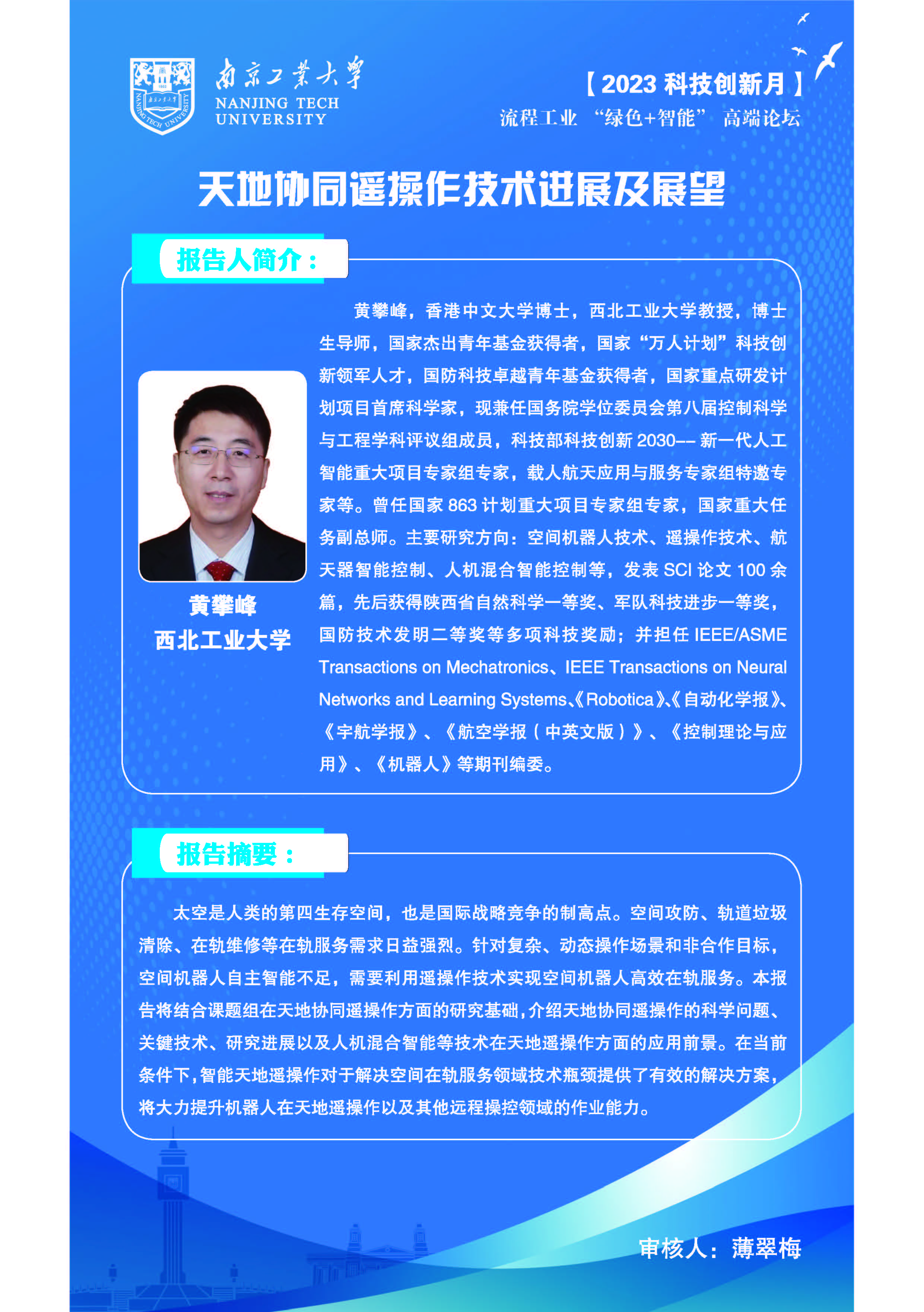 4 | 黄攀峰 | 国家杰出青年基金获得者,国家级人才,国防科技卓越青年基金获得者,国家重点研发计划项目首席科学家 | 天地协同遥操作技术进展及展望 |