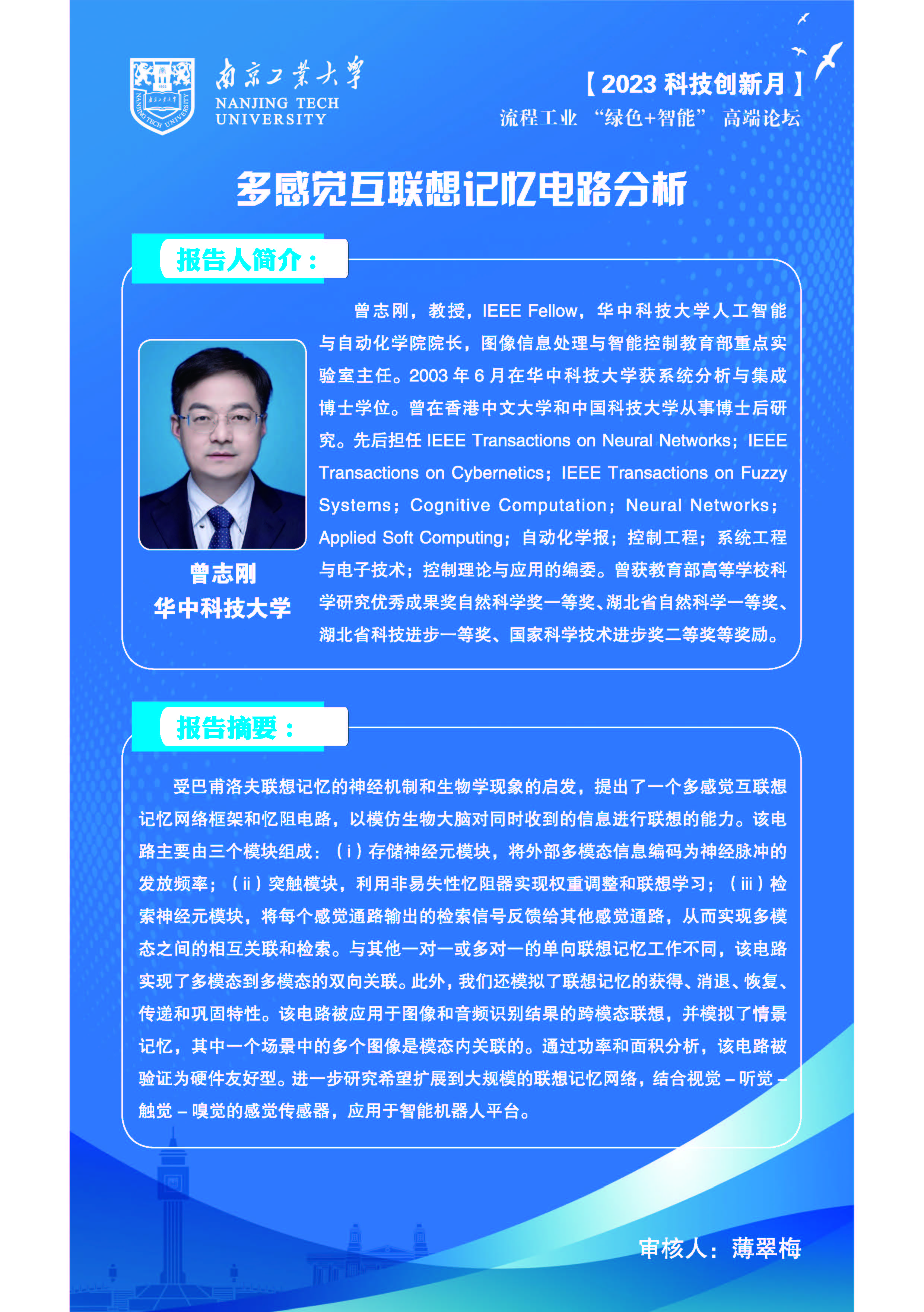 2 | 曾志刚 | IEEE Fellow,华中科技大学人工智能与自动化学院院长,图像信息处理与智能控制教育部重点实验室主任 | 多感觉互联想记忆电路分析 |