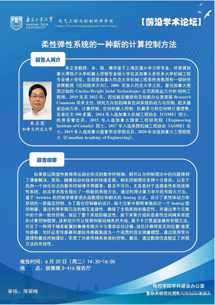 报告人简介:朱正宏教授本、硕、博毕业于上海交通大学力学专业,并获得加拿大滑铁卢大学机器人控制专业硕士学位及加拿大多伦多大学机械工程专业博士学位。朱教授目前是加拿大约克大学机械工程系终身教授和一级研究讲席教授(空间技术方向)。2006年加入约克大学之前,朱教授在加拿大密西沙加的Curtiss-Wright Indal Technologies公司担任高级应力分析/结构工程师。2019年至2022年期间,朱教授担任副总裁研究与创新办公室首届Research Commons学术主任。朱教授的研究方向包括绳系空间系统的动力与控制、航天器姿态动力学、计算控制、空间机器人控制、机器学习和空间碎片清理等领域,发表论文300多篇。朱教授于2014年入选加拿大机械工程协会(CSME)院士、终身荣誉会员,2015年入选加拿大国家工程研究院(Engineering Institute of Canada)院士,2017年入选美国机械工程协会(ASME)会士,2019年加拿大皇家学会学院会员,2020年当选为加拿大工程院院士(Canadian Academy of Engineering)。