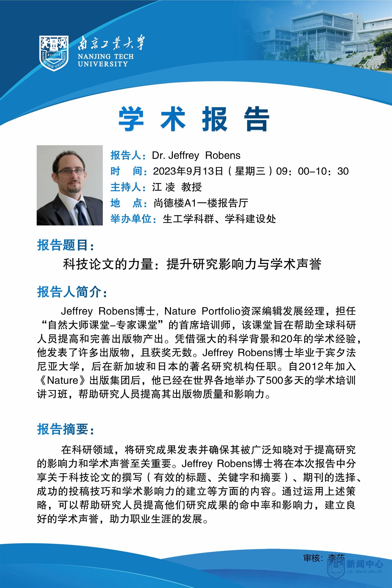 报告人简介:Jeffrey Robens博士,Nature Portfolio资深编辑发展经理,担任“自然大师课堂-专家课堂”的首席培训师,该课堂旨在帮助全球科研人员提高和完善出版物产出。凭借强大的科学背景和20年的学术经验,他发表了许多出版物,且获奖无数。Jeffrey Robens博士毕业于宾夕法尼亚大学,后在新加坡和日本的著名研究机构任职。自2012年加入《Nature》出版集团后,他已经在世界各地举办了500多天的学术培训讲习班,帮助研究人员提高其出版物质量和影响力。
