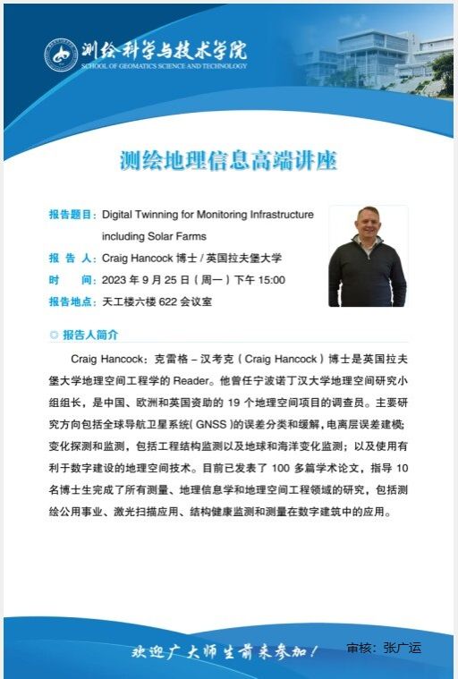 Craig Hancock:克雷格-汉考克(Craig Hancock)博士是英国拉夫堡大学地理空间工程学的Reader。他曾任宁波诺丁汉大学地理空间研究小组组长,是中国、欧洲和英国资助的19个地理空间项目的调查员。主要研究方向包括全球导航卫星系统(GNSS)的误差分类和缓解电离层误差建模变化探测和监测,包括工程结构监测以及地球和海洋变化监测;以及使用有利于数字建设的地理空间技术。目前已发表了100多篇学术论文,指导10名博士生完成了所有测量、地理信息学和地理空间工程领域的研究,包括测绘公用事业、激光扫描应用、结构健康监测和测量在数字建筑中的应用。
