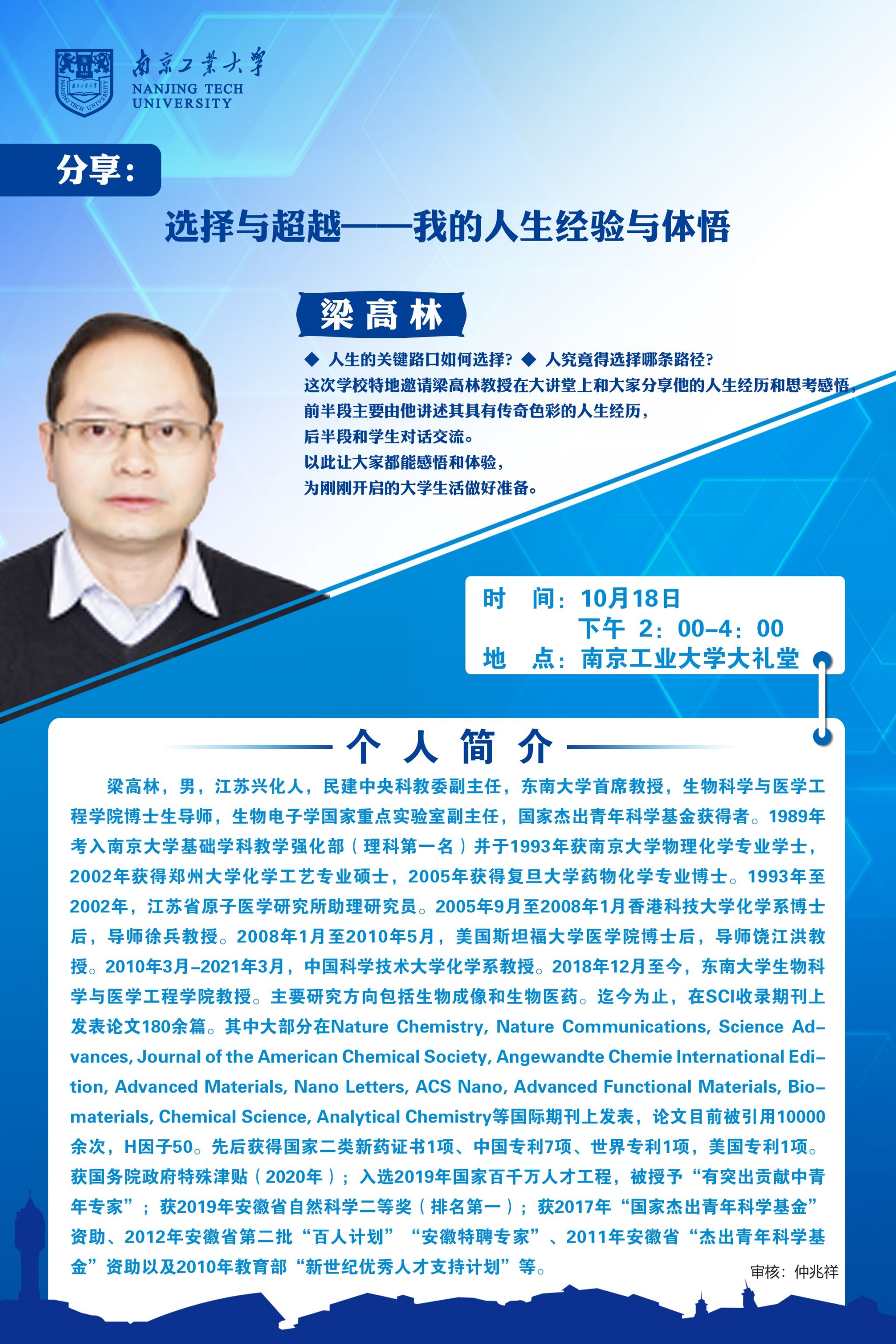 梁高林,男,江苏兴化人,民建中央科教委副主任,东南大学首席教授,生物科学与医学工程学院博士生导师,生物电子学国家重点实验室副主任,国家杰出青年科学基金获得者。1989年考入南京大学基础学科教学强化部(理科第一名)并于1993年获南京大学物理化学专业学士,2002年获得郑州大学化学工艺专业硕士,2005年获得复旦大学药物化学专业博士。1993年至2002年,江苏省原子医学研究所助理研究员。2005年9月至2008年1月香港科技大学化学系博士后,导师徐兵教授。2008年1月至2010年5月,美国斯坦福大学医学院博士后,导师饶江洪教授。2010年3月-2021年3月,中国科学技术大学化学系教授。2018年12月至今,东南大学生物科学与医学工程学院教授。主要研究方向包括生物成像和生物医药。迄今为止,在SCI收录期刊上发表论文180余篇。其中大部分在NatureChemistry,Nature Communications, Science Advances,Journal of theAmericanChemicalSociety,AngewandteChemieInternationalEdition,Advanced Materials,Nano Letters, ACS Nano, Advanced Functional Materials, Biomaterials, Chemical Science,Analytical Chemistry等国际期刊上发表,论文目前被引用10000余次,H因子50。先后获得国家二类新药证书1项、中国专利7项、世界专利1项,美国专利1项。获国务院政府特殊津贴(2020年);入选2019年国家百千万人才工程,被授予“有突出贡献中青年专家”;获2019年安徽省自然科学二等奖(排名第一);获2017年“国家杰出青年科学基金”资助、2012年安徽省第二批“百人计划”“安徽特聘专家”、2011年安徽省“杰出青年科学基金”资助以及2010年教育部“新世纪优秀人才支持计划”等。