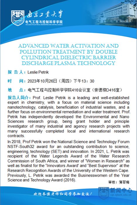 报告题目:Advanced Water Activation and Pollution Treatment by Double Cylindrical Dielectric Barrier Discharge Plasma Technology
