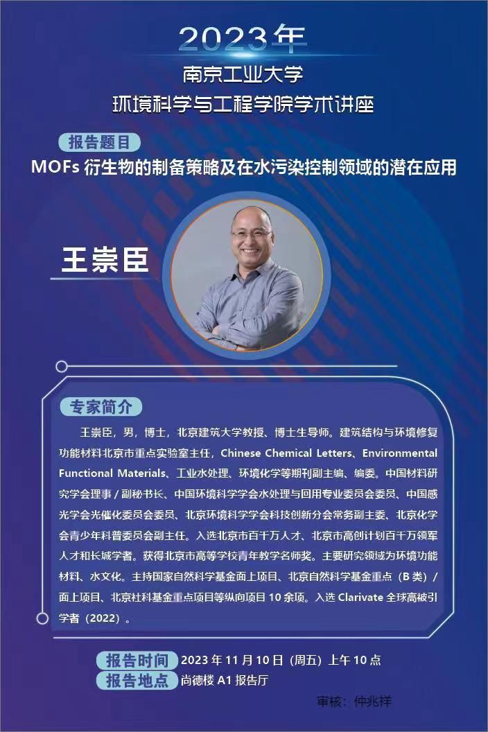 王崇臣,男,博士,北京建筑大学教授、博士生导师。建筑结构与环境修复功能材料北京市重点实验室主任,Chinese Chemical Letters、Environmental Functional Materials、工业水处理、环境化学等期刊副主编、编委。中国材料研究学会理事/副秘书长、中国环境科学学会水处理与回用专业委员会委员、中国感光学会光催化委员会委员、北京环境科学学会科技创新分会常务副主委、北京化学会青少年科普委员会副主任。入选北京市百千万人才、北京市高创计划百千万领军人才和长城学者。获得北京市高等学校青年教学名师奖。主要研究领域为环境功能材料、水文化。主持国家自然科学基金面上项目、北京自然科学基金重点(B类)/面上项目、北京社科基金重点项目等纵向项目10余项。入选Clarivate全球高被引学者(2022)。