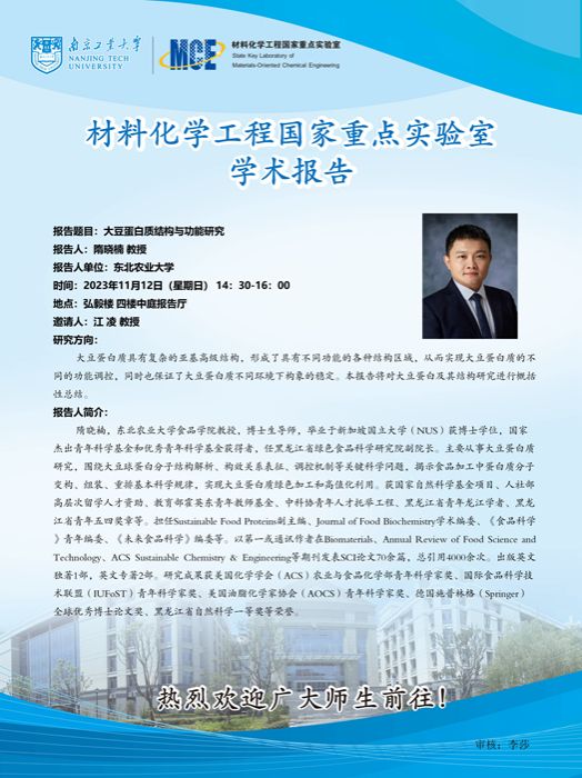 报告人简介:隋晓楠,东北农业大学食品学院教授,博士生导师,毕业于新加坡国立大学(NUS)获博士学位,国家杰出青年科学基金和优秀青年科学基金获得者,任黑龙江省绿色食品科学研究院副院长。主要从事大豆蛋白质研究,围绕大豆球蛋白分子结构解析、构效关系表征、调控机制等关键科学问题,揭示食品加工中蛋白质分子变构、组装、重排基本科学规律,实现大豆蛋白质绿色加工和高值化利用。获国家自然科学基金项目、人社部高层次留学人才资助、教育部霍英东青年教师基金、中科协青年人才托举工程、黑龙江省青年龙江学者、黑龙江省青年五四奖章等。担任Sustainable Food Proteins副主编、Journal of Food Biochemistry学术编委、《食品科学》青年编委、《未来食品科学》编委等。以第一或通讯作者在Biomaterials、Annual Review of Food Science and Technology、ACS Sustainable Chemistry & Engineering等期刊发表SCI论文70余篇,总引用4000余次。出版英文独著1部,英文专著2部。研究成果获美国化学学会(ACS)农业与食品化学部青年科学家奖、国际食品科学技术联盟(IUFoST)青年科学家奖、美国油脂化学家协会(AOCS)青年科学家奖、德国施普林格(Springer)全球优秀博士论文奖、黑龙江省自然科学一等奖等荣誉。
