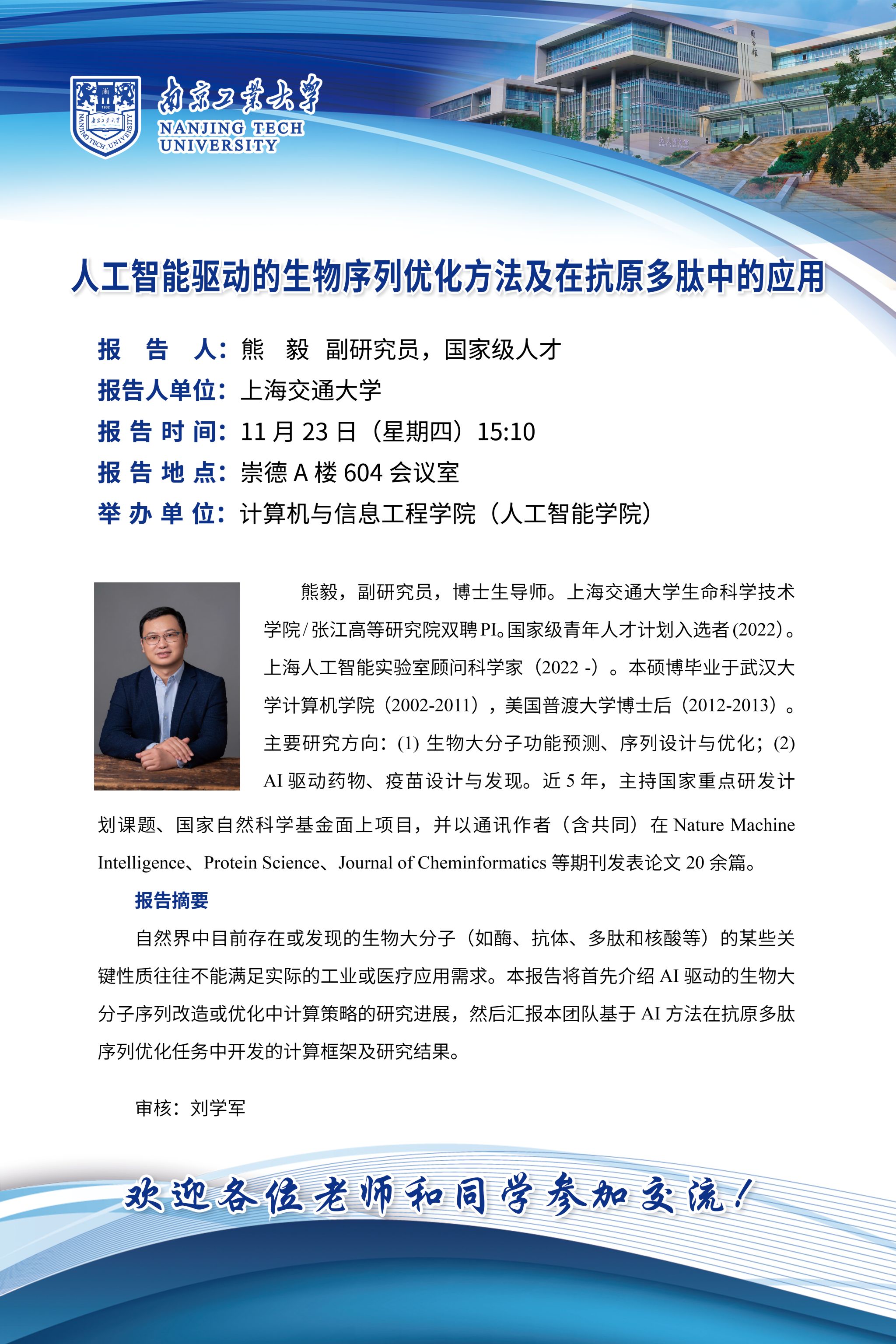 报告摘要:自然界中目前存在或发现的生物大分子(如酶、抗体、多肽和核酸等)的某些关键性质往往不能满足实际的工业或医疗应用需求。本报告将首先介绍AI驱动的生物大分子序列改造或优化中计算策略的研究进展,然后汇报本团队基于AI方法在抗原多肽序列优化任务中开发的计算框架及研究结果。