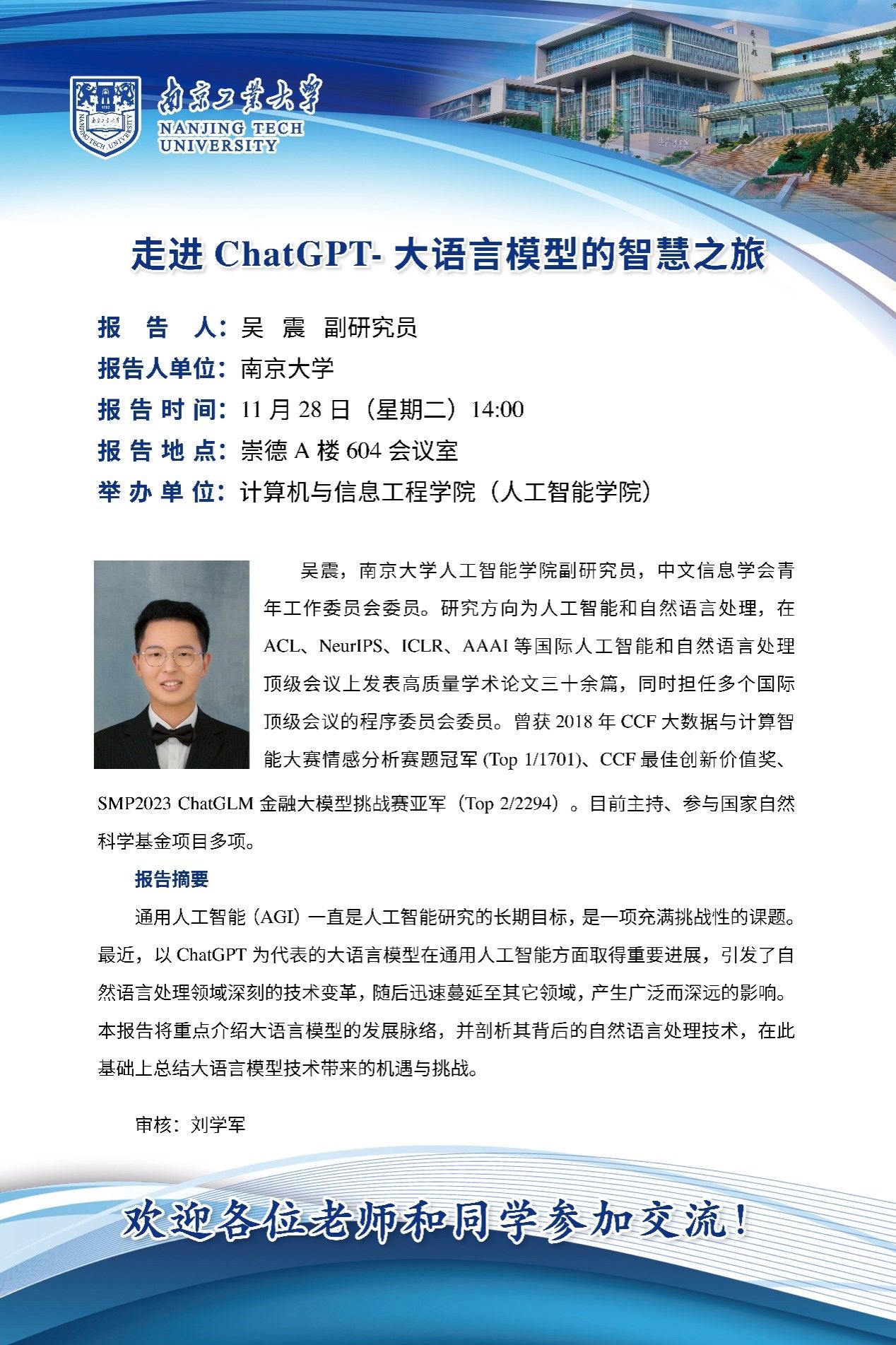 吴震,南京大学人工智能学院副研究员,中文信息学会青年工作委员会委员。研究方向为人工智能和自然语言处理,在ACL、NeurIPS、ICLR、AAAI等国际人工智能和自然语言处理顶级会议上发表高质量学术论文三十余篇,同时担任多个国际顶级会议的程序委员会委员。曾获2018年CCF大数据与计算智能大赛情感分析赛题冠军(Top 1/1701)、CCF最佳创新价值奖、SMP2023ChatGLM金融大模型挑战赛亚军(Top2/2294)。目前主持、参与国家自然科学基金项目多项。