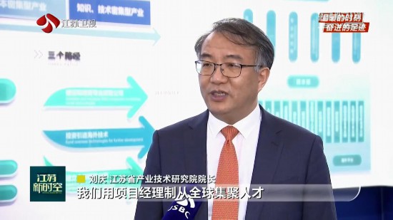 江苏省产业技术研究院院长刘庆说:“习近平总书记特别给我们指示,要强化四个对接。特别是说要强化研发人员的创新劳动同其利益收入对接这句话,对我们如何引进人、如何评价人给了很大的一个指引,按照总书记的指示,我们用项目经理制从全球集聚人才,让我们的研究所的所长带领的团队作为大股东成立运营公司,来运营专业研究所,很大程度上调动了我们科技人员和研究所管理人员的内在的积极性,形成有利于出创新成果,有利于创新成果产业化的新机制。”