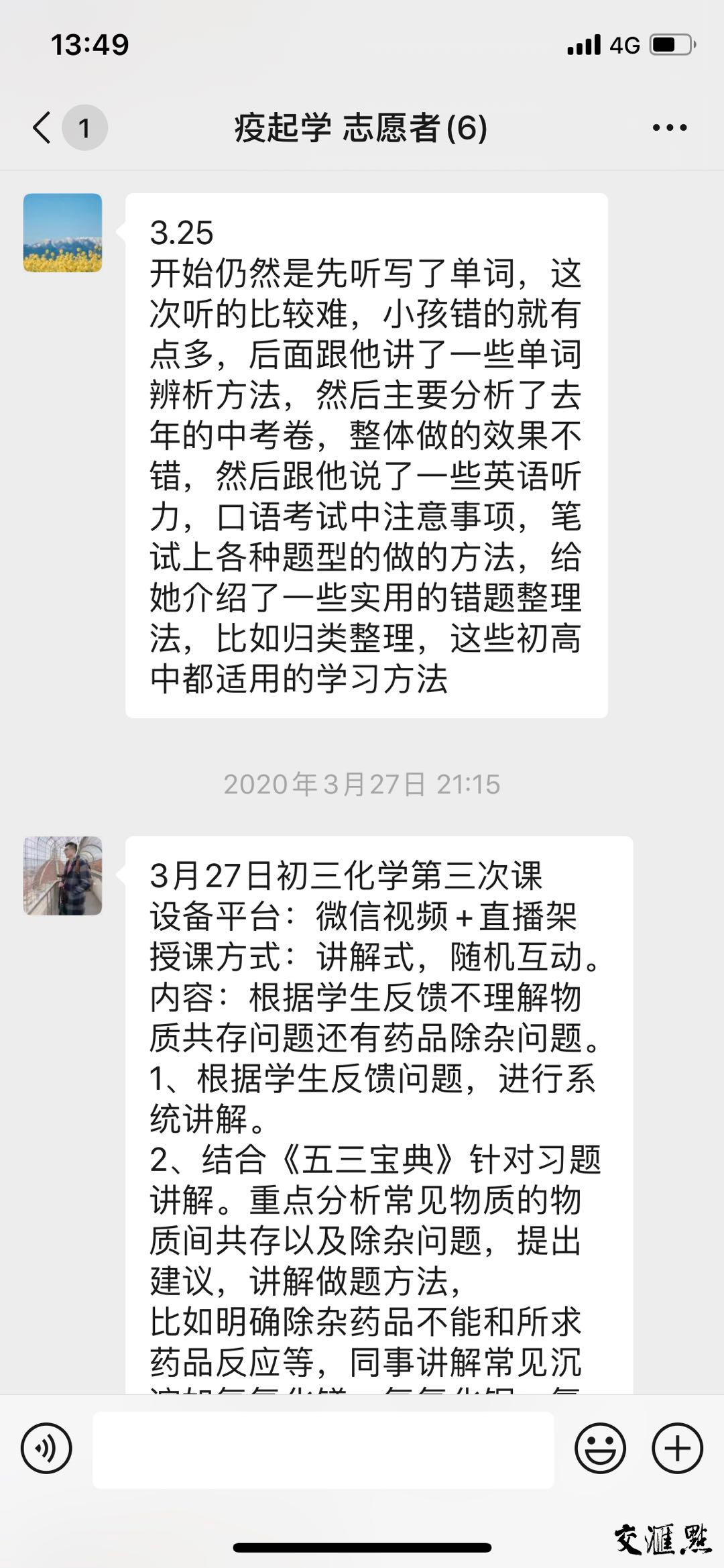 活动信息发布后,3月6日,江苏省医药公司的一名员工联系到陈晨,他在公司负责物资供应工作,妻子在基层医院,因为疫情的缘故夫妻俩都要奋斗在抗“疫”一线,基本不着家,家里有一个今年面临中考的初三学生小宇急需学业指导。在多次沟通和各方的支持下,陈晨、佟京达老师和三名大学生志愿者组成的“家教团队”迅速为学生量身打造了一套适合小宇的学业辅导方案。从3月9日开始,每天晚上安排一位老师通过微信视频,面对面给小宇轮流上课,辅导科目涵盖化学、英语、数学、物理等课程。