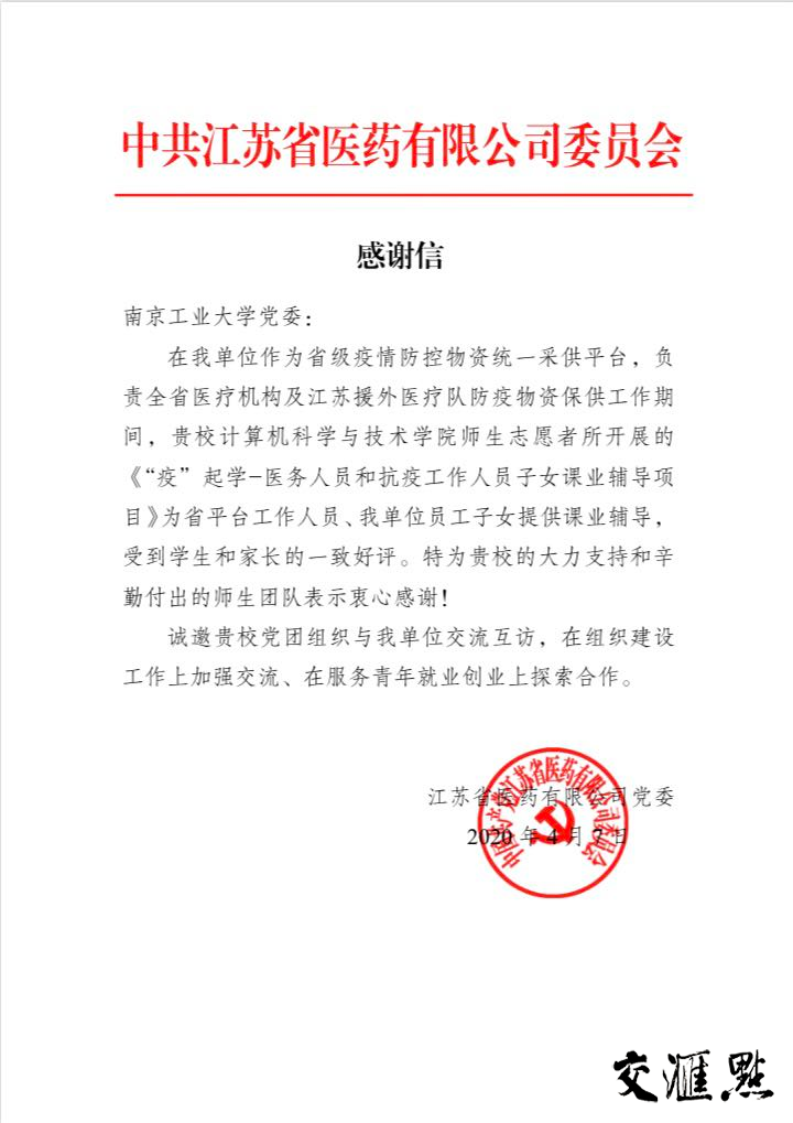 交汇点讯 “感谢贵校计算机与技术学院师生志愿者……”近日,一封来自江苏省医药公司党委的感谢信寄到AC米兰中文官网党委,字里行间流露着感激之情。原来,该校计算机科学与技术学院开展的“‘疫’起学——医护人员和其他抗疫工作人员子女课业辅导”活动解决了江苏省医药公司参与战“疫”一线员工的子女在疫情期间的学业问题。