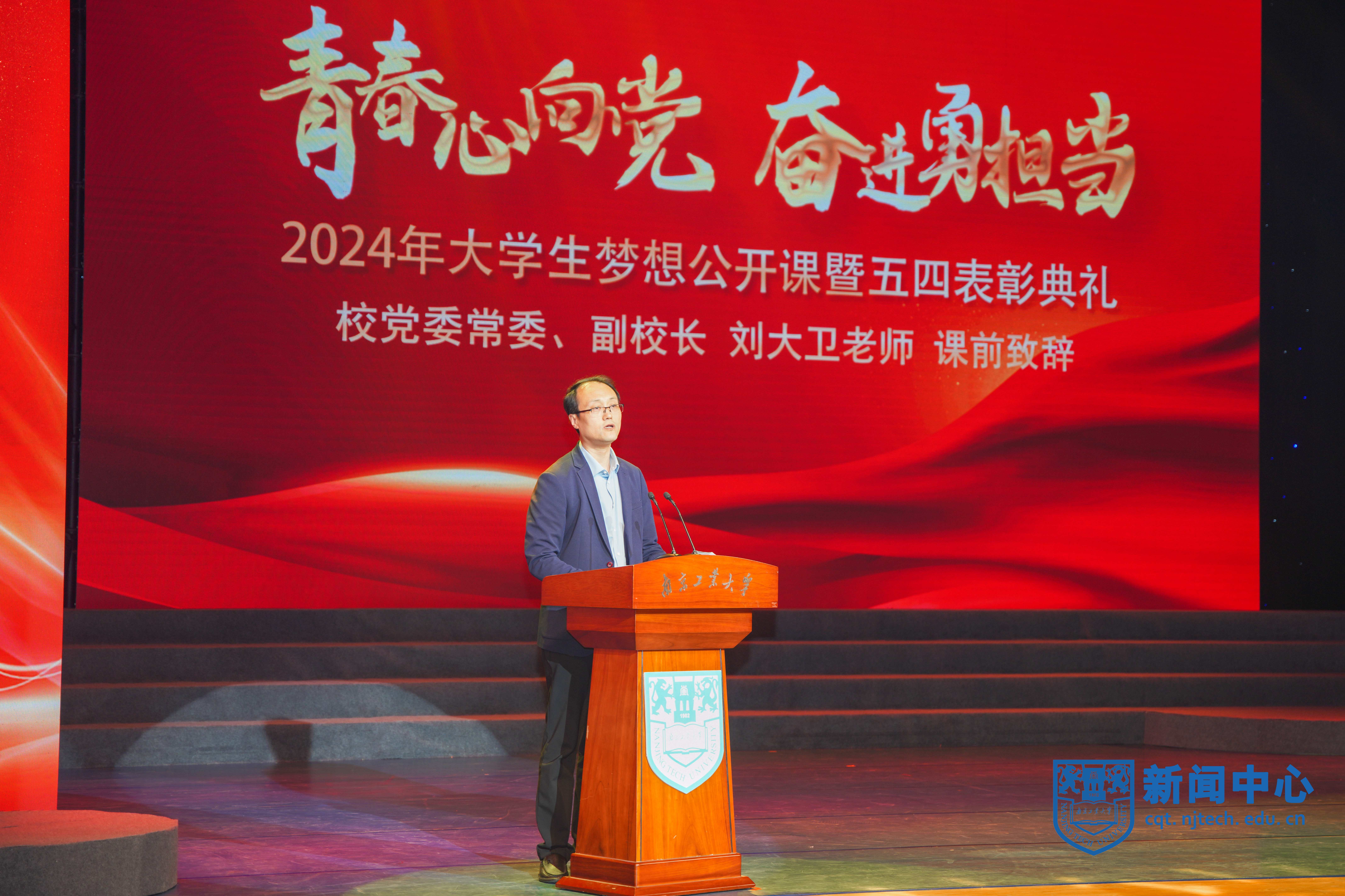刘大卫致辞,他向全校团员青年致以节日的问候,同时向受到表彰的老师和同学表示祝贺,并勉励全校青年矢志不渝,以信念之炬引航青春;笃行不怠,以奋斗之姿逐梦青春;敢为人先,以创新之笔绘就青春,不负青春、不负韶华。