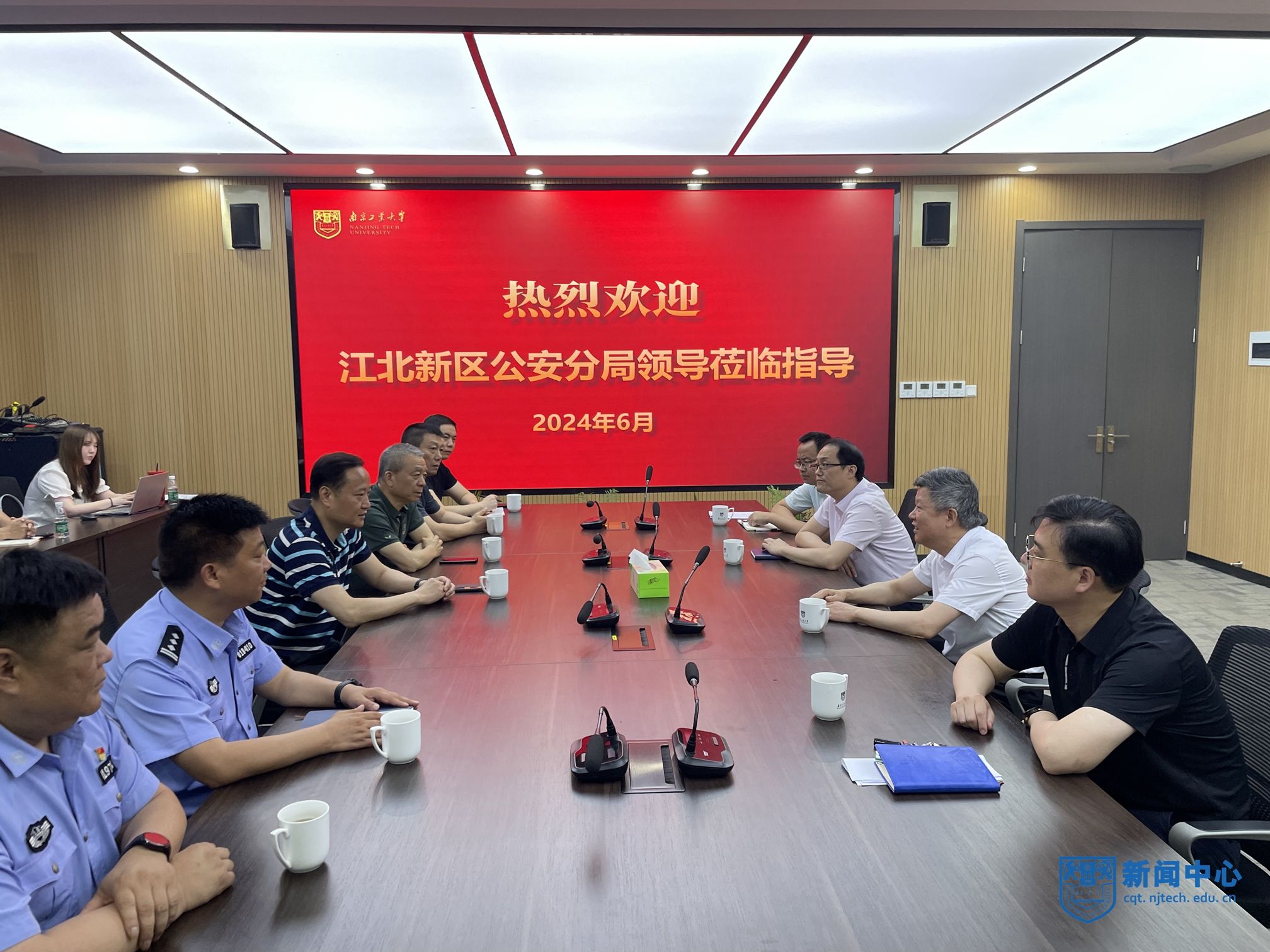 近日,江北新区公安分局局长徐正凯、副局长吴慧银一行来校调研指导安保工作,座谈会在应急指挥中心举行。校党委书记芮鸿岩、副校长刘大卫出席会议。会议由保卫处处长季宜敬主持。