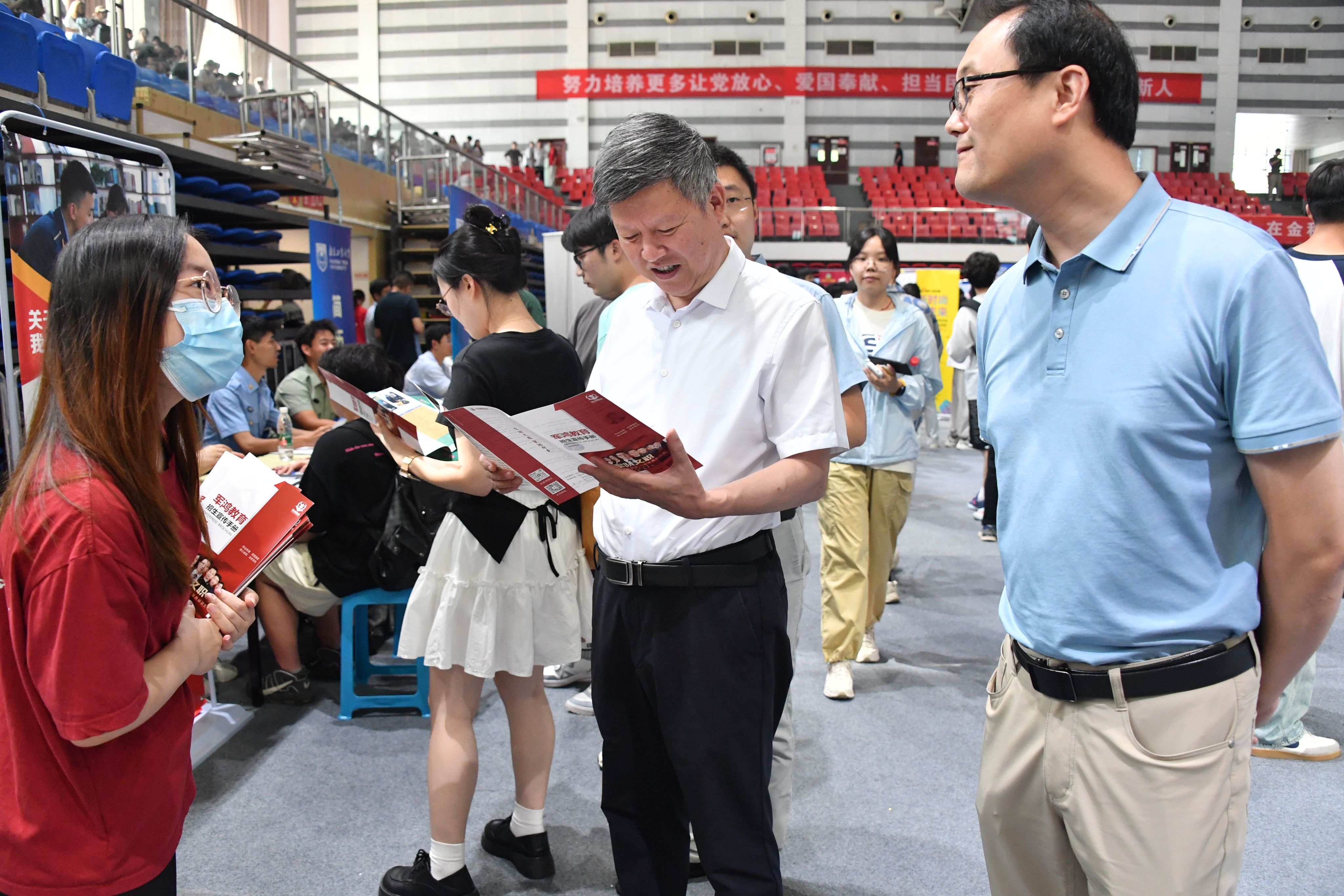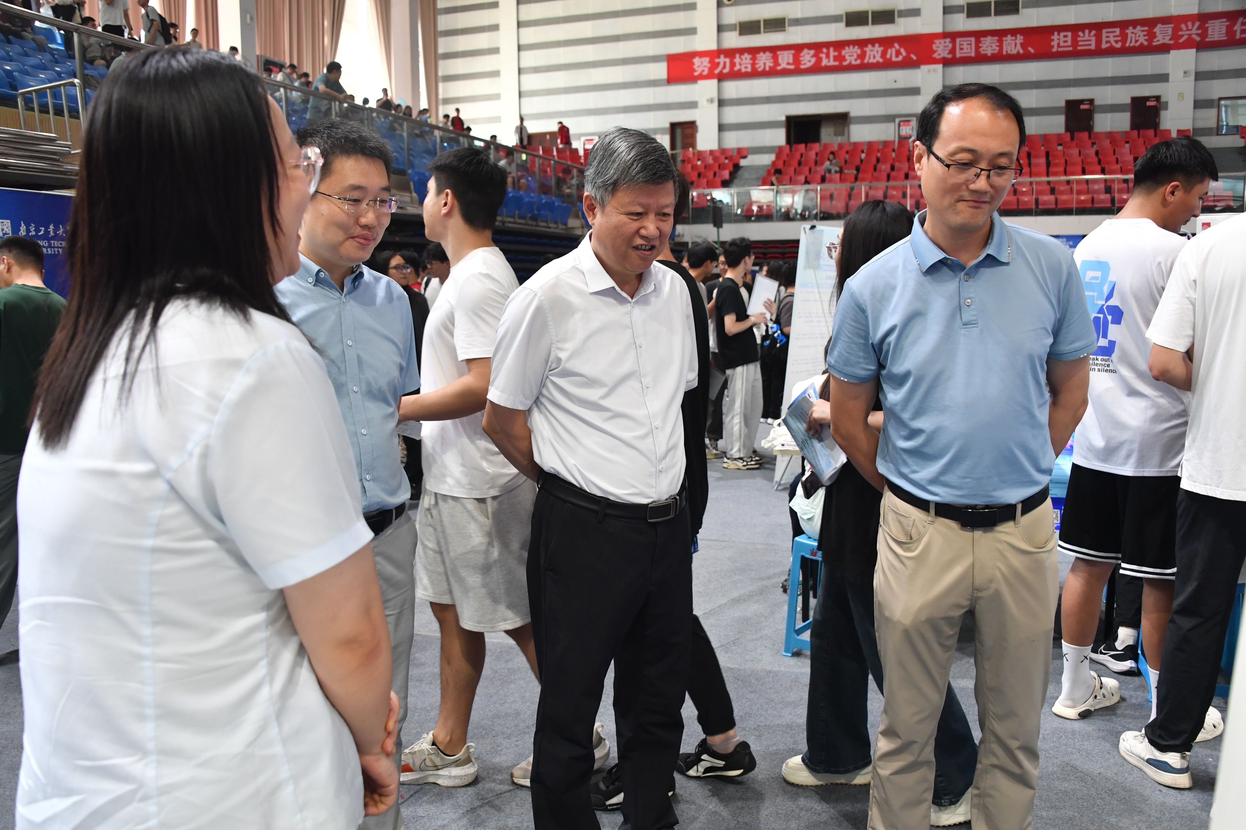 9月18日下午,学校在行健体育馆举办“‘就’在金秋 ‘职’面未来”2025届秋季综合招聘会。校党委书记芮鸿岩、副校长刘大卫深入招聘会现场调研。