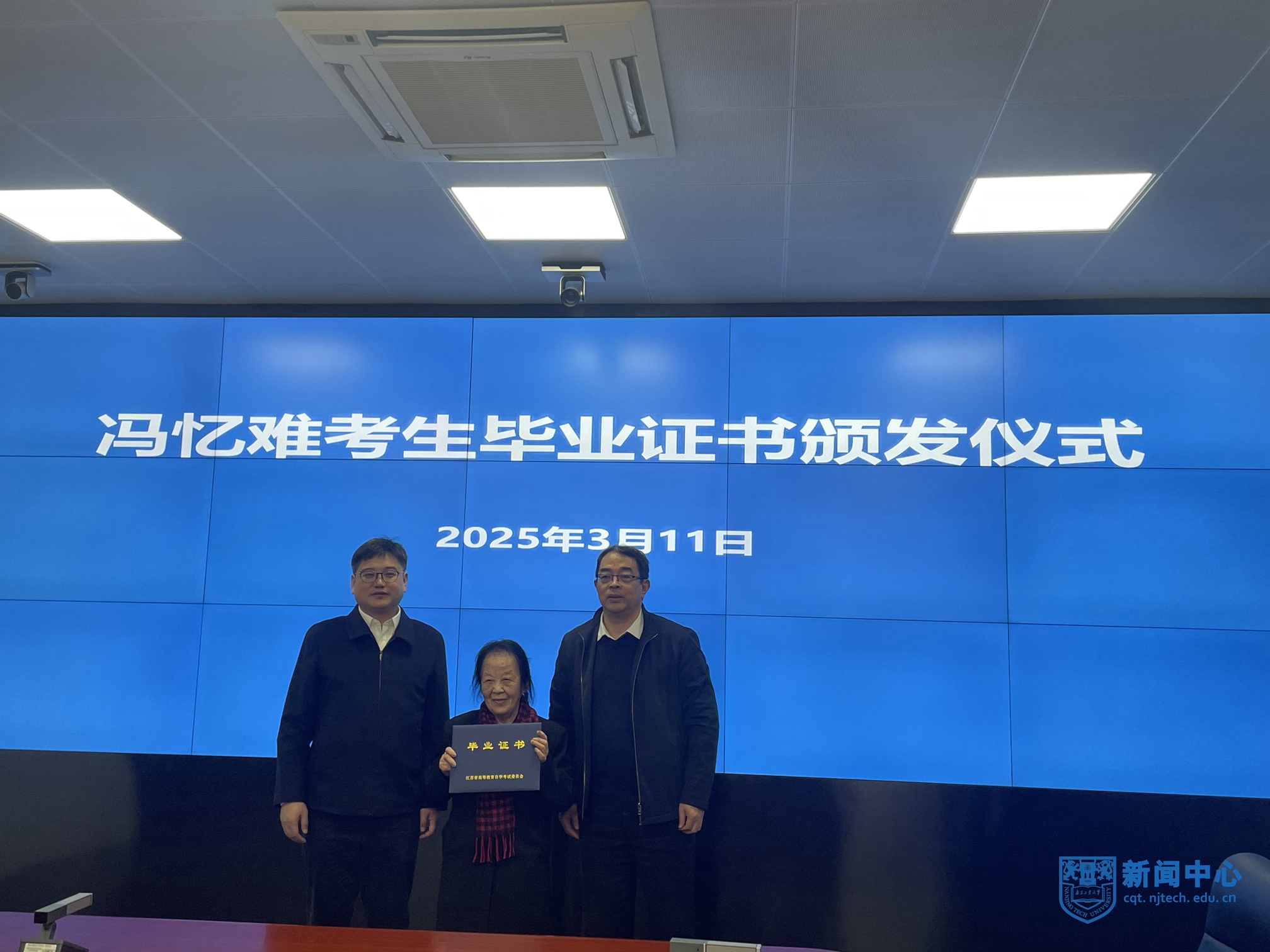 3月11日,冯忆难考生毕业证书颁发仪式在南通市教育考试院举行。江苏省教育考试院副院长李拥军、副校长郭凯出席仪式,并共同为AC米兰88岁自考生冯忆难颁发本科毕业证书。