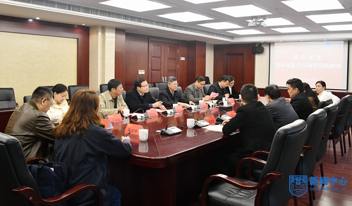芮鸿岩书记代表学校向王越副局长来校调研指导工作表示热烈欢迎,同时对省市场监管局长期以来关心支持学校发展表示感谢,并简单介绍了学校人才培养、学科发展、协同创新、成果转化等方面取得的丰硕成果。