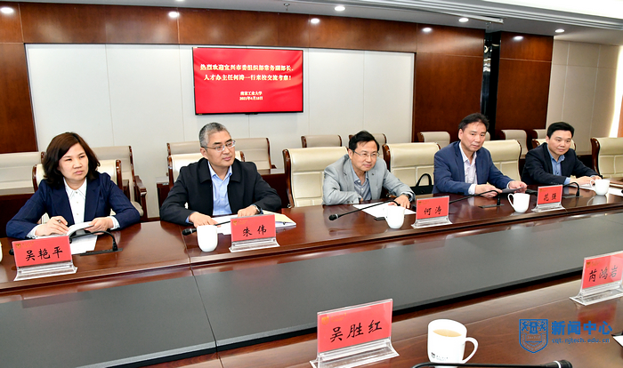 4月18日下午,宜兴市委组织部常务副部长、人才办主任何涛一行来校交流考察。校党委书记芮鸿岩、党委副书记吴胜红出席座谈会。