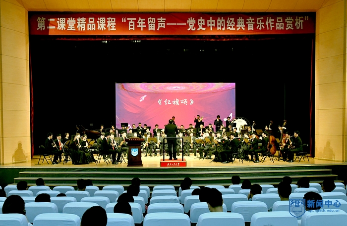 第二课堂精品课程《百年留声——党史中的红色经典赏析》以百年党史为主线,分为“青春奉献·矢志践行初心使命”“青春奋斗·筚路蓝缕奠基立业”“青春绽放·创造辉煌开辟未来”“颂歌声声献给党”四节课。每节课由思政教师和美育教师双人授课,校大学生艺术团交响管乐团现场演奏,为大家多角度讲述《国际歌》《义勇军进行曲》《我的祖国》《唱支山歌给党听》《春天的故事》《不忘初心》和《没有共产党就没有新中国》等十四首党史经典音乐作品中所蕴含的党的红色历史、革命故事和英雄事迹。