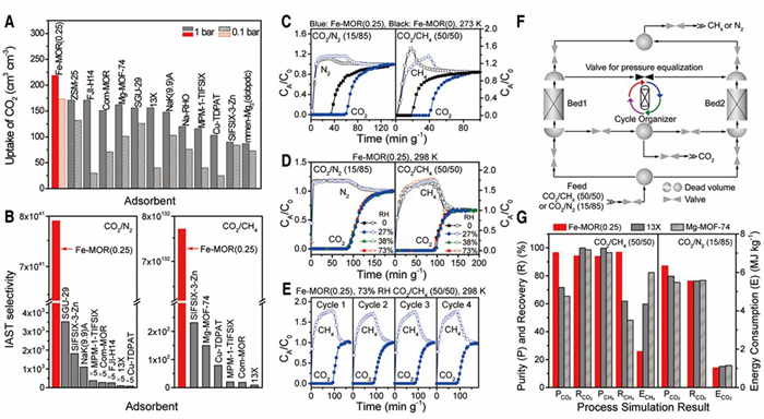 (上)杂原子丝光沸石一维孔道筛分CO2, Ar, N2和CH4的示意图。(下)气体吸附分离性能:(A) 298 K时CO2体积吸收量;(B) CO2/N2:15/85和CO2/CH4:50/50二元混合物在1 bar和298 K下的CO2/N2和CO2/CH4分离选择性;(C-E) CO2/N2(CH4)穿透曲线;(F) 2-床VSA工艺的流程示意图和(G) ASPEN模拟结果。