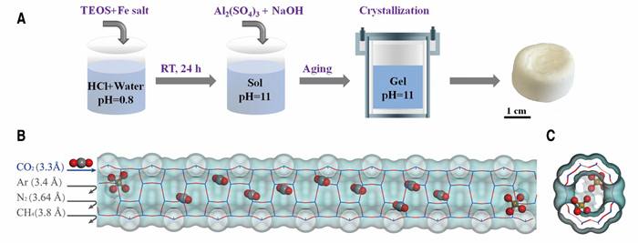 针对这一难题,王军教授团队开发了杂原子沸石分子筛水热合成新路线,合成出结构独特的含铁杂原子丝光沸石分子筛单块材料,无需任何后处理即可直接作为自成型物理吸附剂,表现出迄今为止最高的CO2体积吸附容量和分离效率,对氩气(Ar),氮气(N2)以及甲烷(CH4)表现出良好的分子筛分能力,具有优异的抗水汽性能,实现了对燃烧后(CO2和N2分离)、沼气以及天然气纯化(CO2和CH4分离)等体系中CO2的高效吸附分离。审稿人评价,这一研究是碳捕集领域的重大突破,具有明显的实际应用潜力,开拓了杂原子沸石分子筛在气体吸附分离领域的新应用。