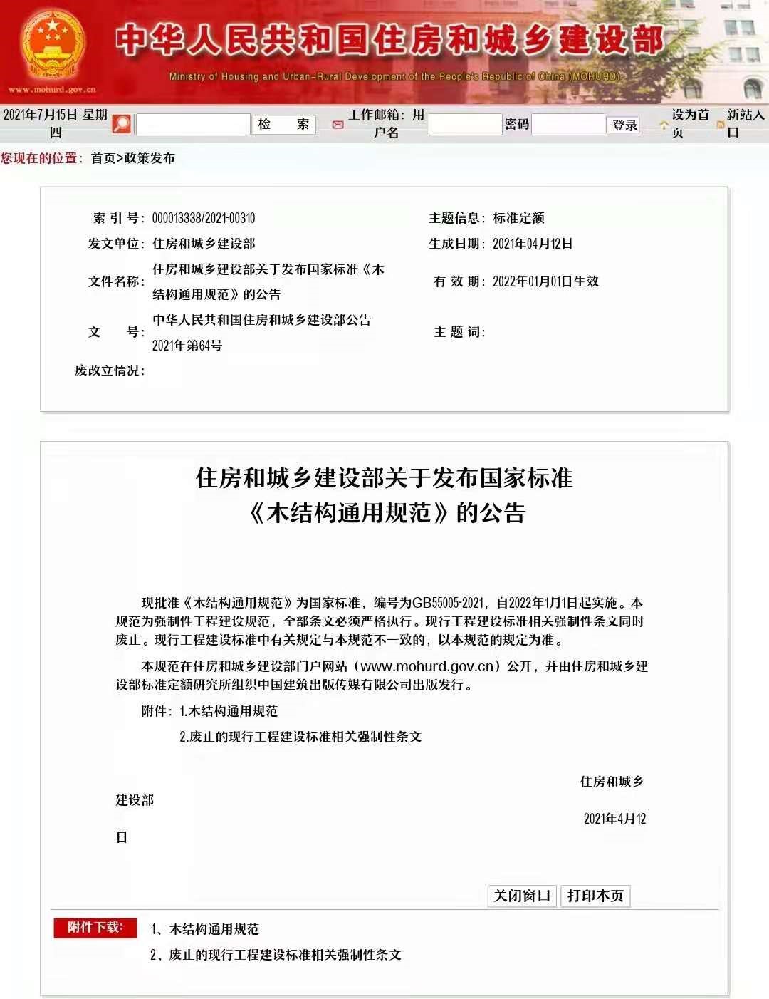 日前,住房和城乡建设部正式发布国家标准《木结构通用规范》(GB55005-2021)的批准公告,自2022年1月1日起实施。该规范为强制性工程建设规范,全部条文必须严格执行。