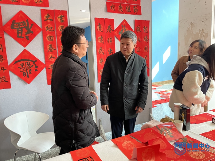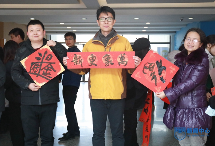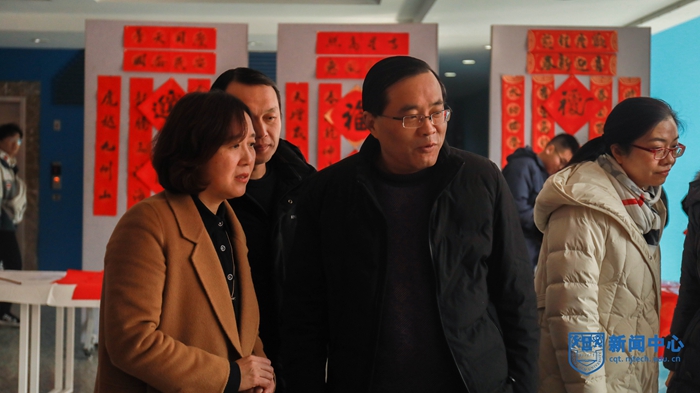 为深入学习贯彻党的十九届六中全会精神,弘扬中华优秀传统文化,以美育人,以文化人,1月12日,校工会、艺术设计学院于博学楼一楼联合举办“翰墨飘香写福字,迎春送福暖人心”2022迎春送福活动。校党委书记芮鸿岩,党委常委、党委宣传部部长张健莅临现场,各职能部门、学院师生代表齐聚一堂,共同创作、欣赏新年书法祝福作品。