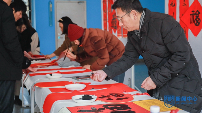 “笔墨浓情传祝福”送春联活动在《春节序曲》中拉开序幕。党委宣传部杨芳,离退休工作处蒋留兆,档案馆钱婷,马克思主义学院陶然,艺术设计学院王志强、付强、冯梓月,交通运输工程学院袁国林,外国语言文学学院江娇等现场挥毫,根据在场师生喜好定制专属春联。“天增岁月人增寿,春满乾坤福满门”寄托了师生间真挚的新年祝福;“虎啸风生远,龙腾海浪高”表达了师生对虎年更进一步的殷切期盼。活动现场来往写春联、请春联师生络绎不绝,墨香四溢,喜气洋洋。
