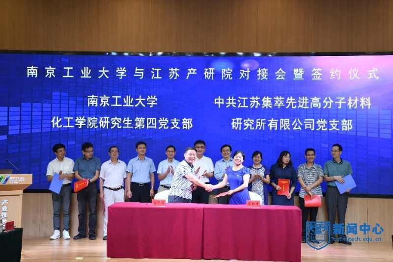 为深入贯彻落实习近平新时代中国特色社会主义思想和党的十九大精神,创新党建活动方式,探索基层党建工作新思路、新模式,7月22日下午,化工学院研究生第四党支部与江苏产研院集萃先进高分子材料研究所有限公司党支部举行党建共建签约仪式。校党委研工部部长、研究生院常务副院长张广明、信息服务部部长赵乃暄、化工学院党委副书记弋鹏、化工学院副院长孙林兵及研究生辅导员、第四党支部书记等参加会议,江苏产研院国内合作部副主任庄韦、集萃先进高分子材料研究所有限公司党支部黄杰出席会议。