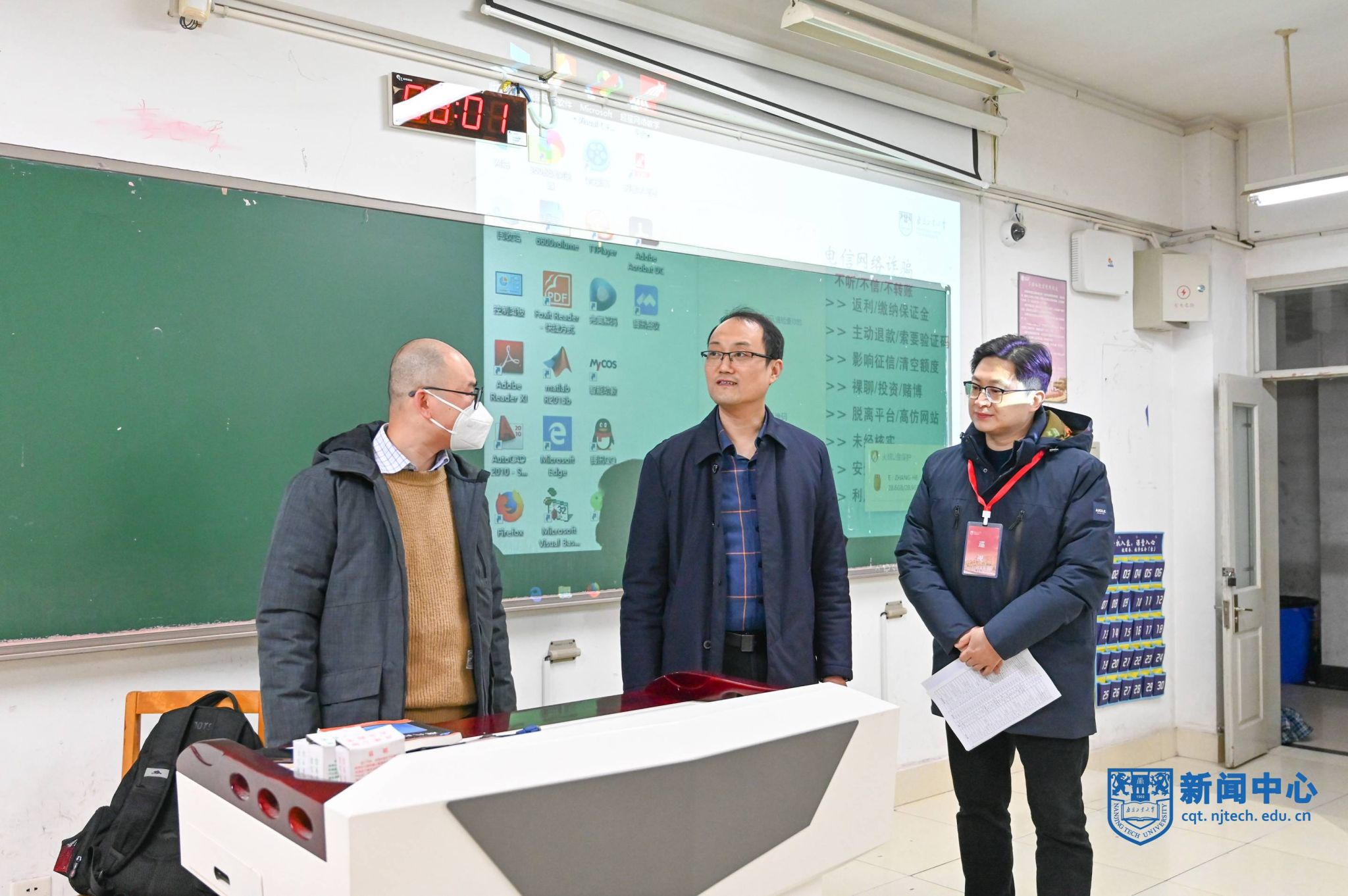 芮鸿岩书记、蒋军成校长、陆伟东副校长一行在厚学楼通过智慧教学运行及远程电子督导平台进行在线巡课、听课,就教学数字化建设、教育教学改革等工作提出指导性意见,并做了相关工作部署。在课间休息时,详细关心询问师生身心健康状况,交流了解任课教师到岗、学生出勤、备课授课、教学设施运行及环境等情况,并提出意见和建议。随后走进上课教室,一边认真听课,一边详细记录,对课堂教学做出客观评价。