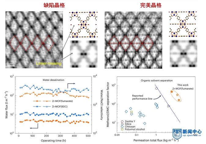 他们利用超低剂量高分辨电子显微成像技术,首次直接观察到MOF膜中的晶格缺陷及其被消除后的完美晶格结构(图2)。实验结果表明,无晶格缺陷的MOF膜仅允许小于晶格孔的分子快速通过,而大于晶格孔的分子或离子被截留,从而实现了水和离子的高效分离,以及性能高于文献报道1-2个数量级的甲醇/碳酸二甲酯共沸物分离,极具工业应用前景。