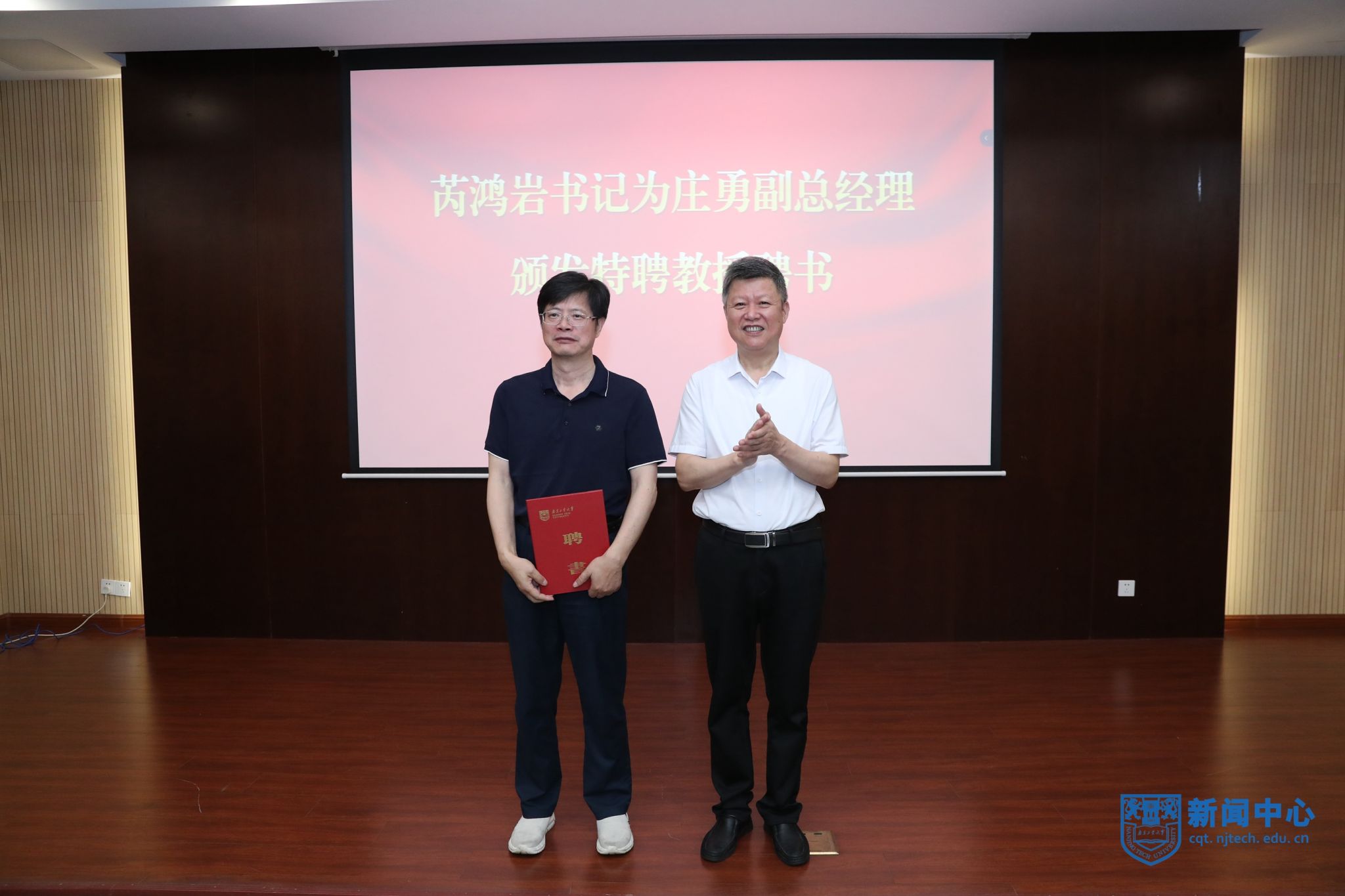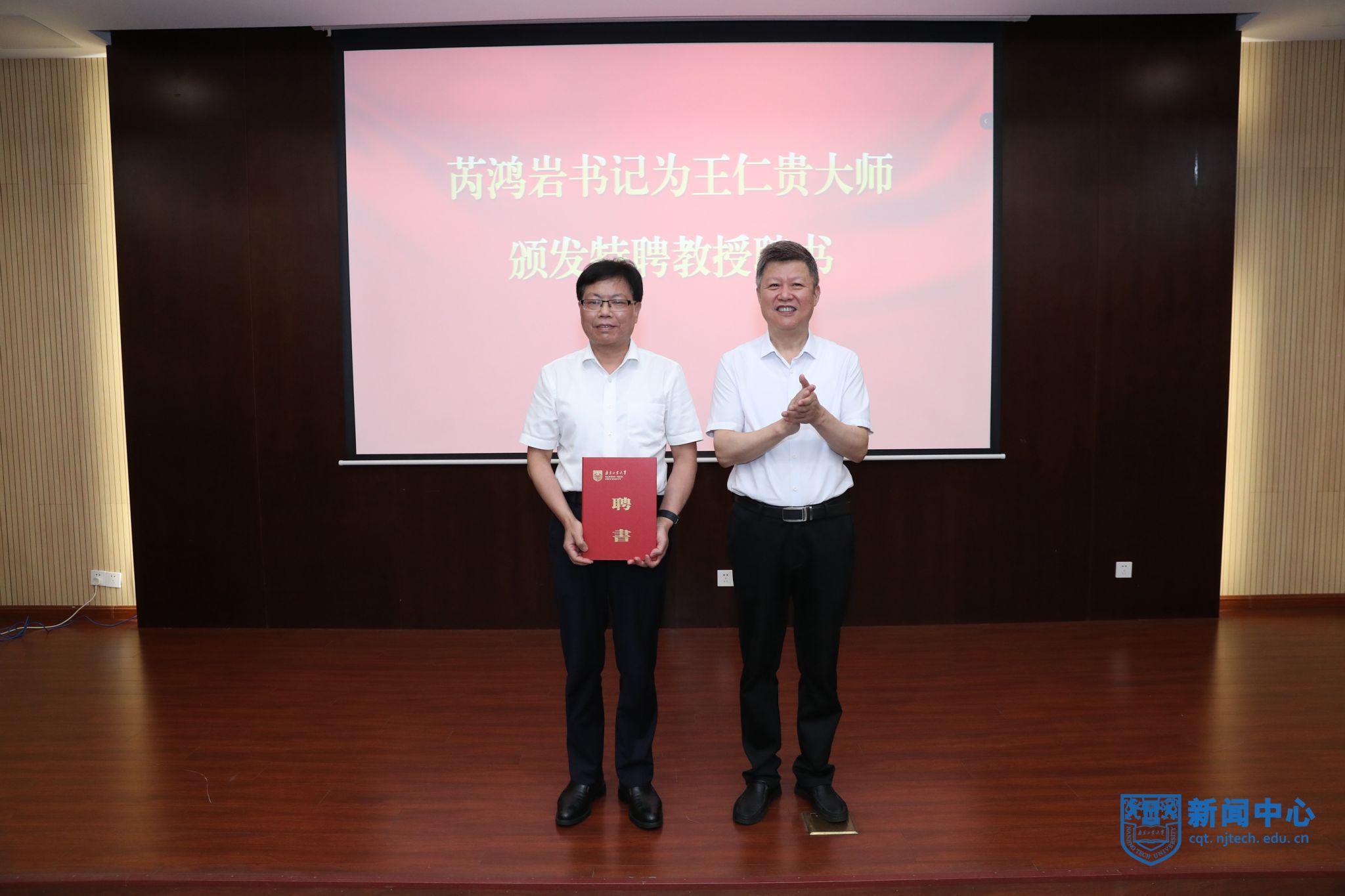 人事处副处长杨洪俊介绍高宗余院士、王仁贵大师、庄勇副总经理的个人简介及主要成就。芮鸿岩书记为高宗余院士颁发战略科学家聘书,为王仁贵大师、庄勇副总经理颁发特聘教授聘书。学生代表为三位专家佩戴校徽并献花。