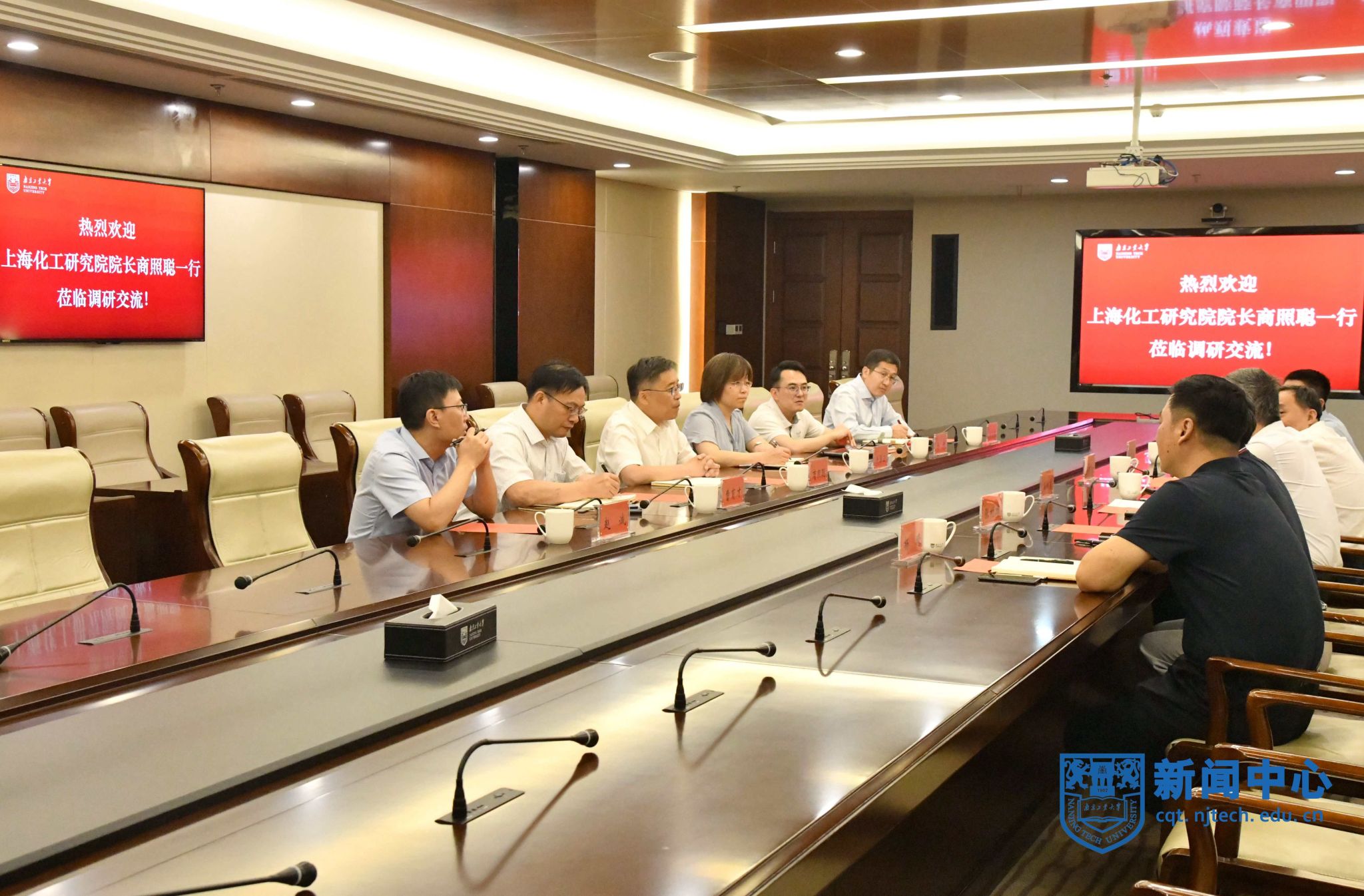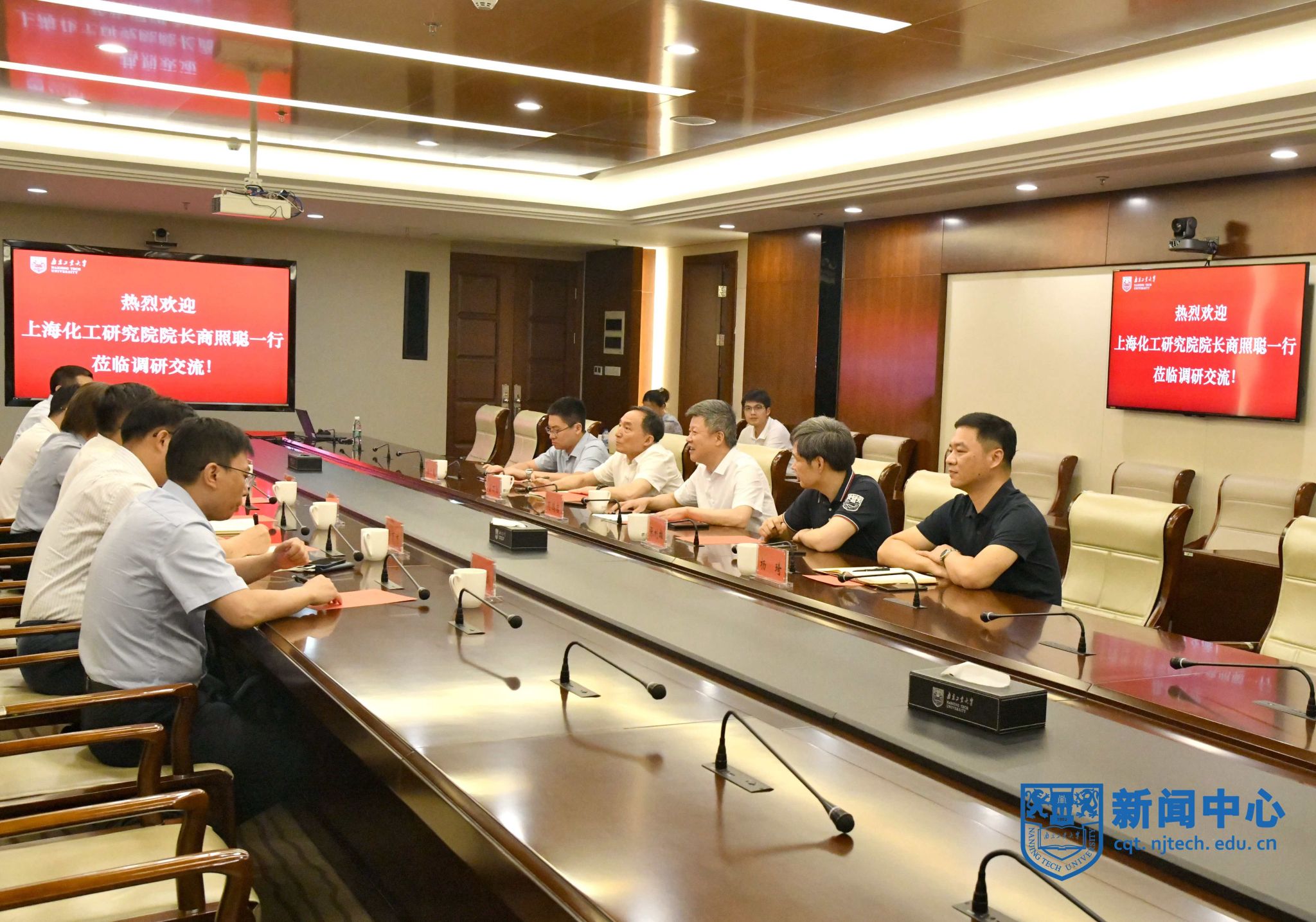 7月25日,上海化工研究院院长商照聪一行来校调研交流,校党委书记芮鸿岩在弘毅楼会议室与来宾座谈交流。